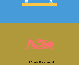 Еще один ужас на Атари. На крыше здания стоит мужик и онанирует. Продукты его деятельности собираются двумя страшными пиксельными девушками. Это отвратительно.