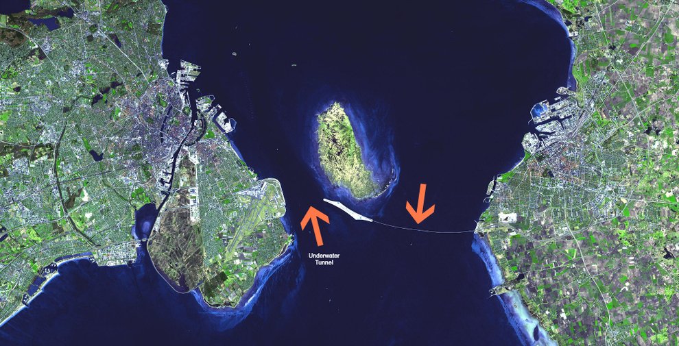 Эресуннский мост — самый длинный и единственный мост в мире с дорожным и железнодорожным движением. Он начинается на стороне Дании около аэропорта как подводный туннель и затем возникает на искусственном острове.