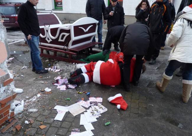Пьяный в дюпелину Санта Клаус c польской ярмарки вместе со своей женщиной-подружкой стал главной достопримечательностью этого мероприятия. 51-летний Дед Мороз и его 31-летняя женщина-помощник весело кричали песни дурным голосом и проезжали по улицам города на санях, запряженных лошадками. Неожиданный гудок автомобиля испугал лошадей, которые помчались на огромной скорости, сделали резкий поворот и опрокинули сани с Санта Клаусом и его подружкой.