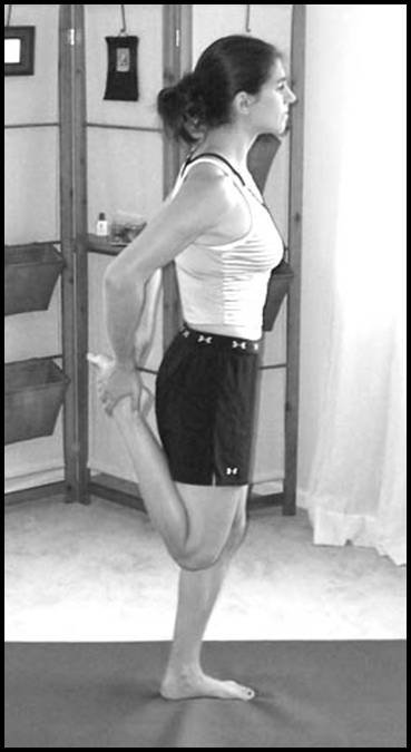 Встань, если ты не уверен в своей устойчивости, обопрись на стену. Держись за лодыжку левой ноги с левой стороны, чтобы создать напряжение в передней части бедра. Не допускай, чтобы колено выходило в сторону или стопа выходила выше позвоночной арки. Можно делать упражнение со стопой вверх, а можно под прямым углом!