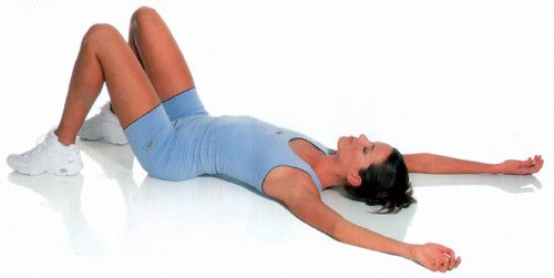 Начни с положения лежа на спине, руки лежат на полу, вдоль тела по бокам. Согни колени и поставь их пятками на пол. Тело остается лежать на полу. Медленно подтяни ноги к ягодицам, вместе с этим переноси прямые руки за голову взмахом, не отрывая их от пола. Делай до тех пор, пока не почувствуешь напряжение в верхней части туловища. Руки по-прежнему лежат на полу. Побудь в этом положении, напрягая мышцы. Дыши. На выдохе принимай исходное положение.