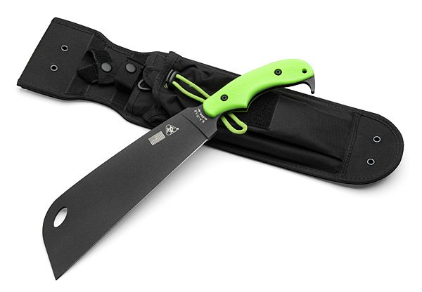 Длина самого резака 10,5 дюйма, а вес 1,6 килограмм. Рубить таким кливером одно удовольствие. В комплект также входит чехол с двумя отсеками для маленького ножика и большого резака. Большой резак дополнительно крепится к чехлу кислотно-зеленым шнуром и липучкой.
