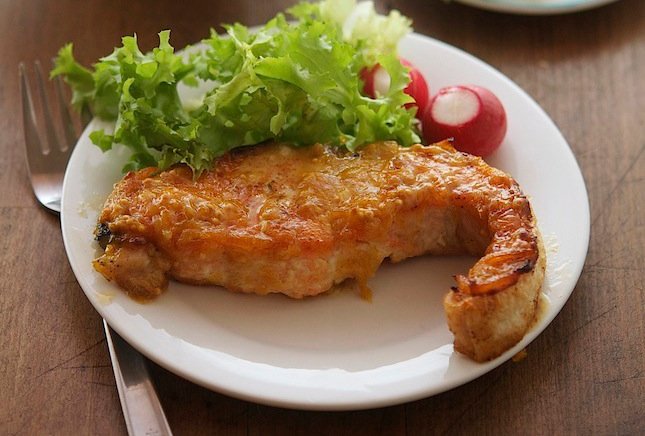 Выключить огонь и смазать филе лосося смесью из апельсинового джема и горчицы, посыпать перцем. Поставить сковородку в духовку и жарить в течение 5 минут, пока верх не станет золотисто-коричневого цвета.