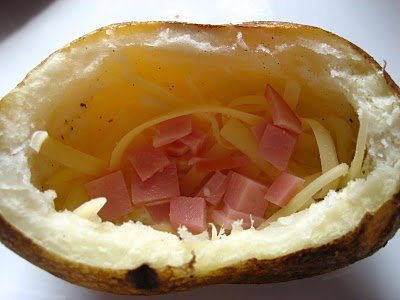 Сыра и ветчины в картофеле должно быть столько, чтобы поместилось еще целое сырое яйцо.