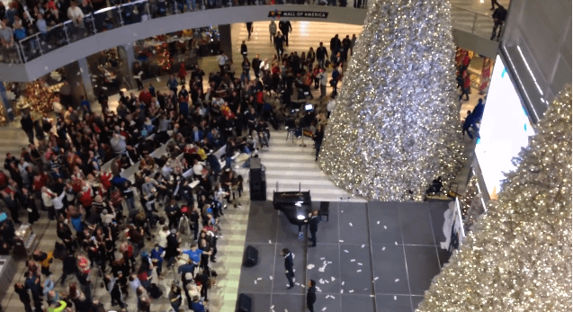 29-летний чувак под романтичную песню, стоя на четвертом этаже торгового центра, стал бросать прямо вниз штуку баксов на беснующуюся толпу людей. Он был на высоте, он стал героем.
